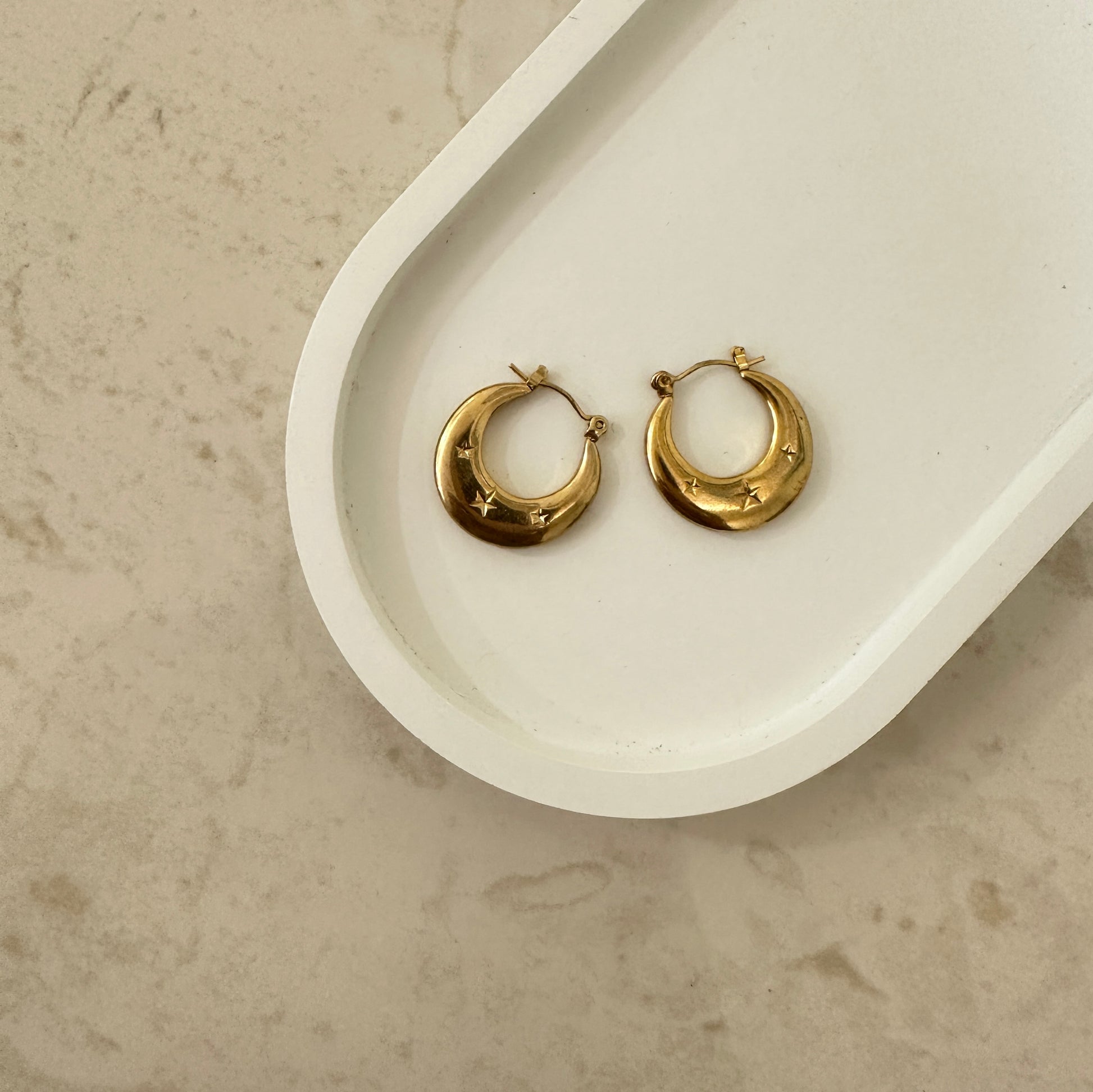 Add a touch of star power to your everyday look with our ESME HOOPS! These minimal yet statement hoops feature delicate star engravings, making them a classic addition to any outfit. Lightweight, hypoallergenic, and anti-tarnish, these gold hoops are also water proof for ultimate wearability. Shine bright like a star with ESME HOOPS!