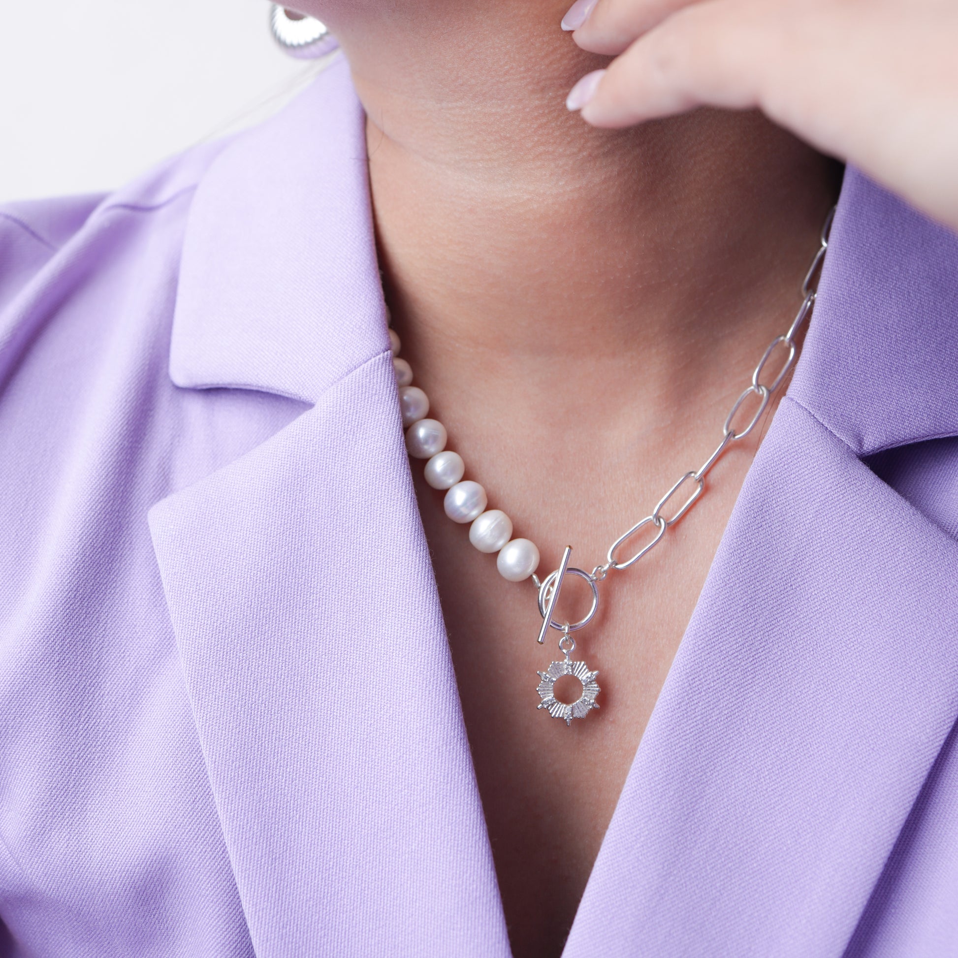 The choice between a gold chain and a string of luminous pearls is no longer one you'll have to make. The Dual Necklace features both, and elegantly decorates your frame.