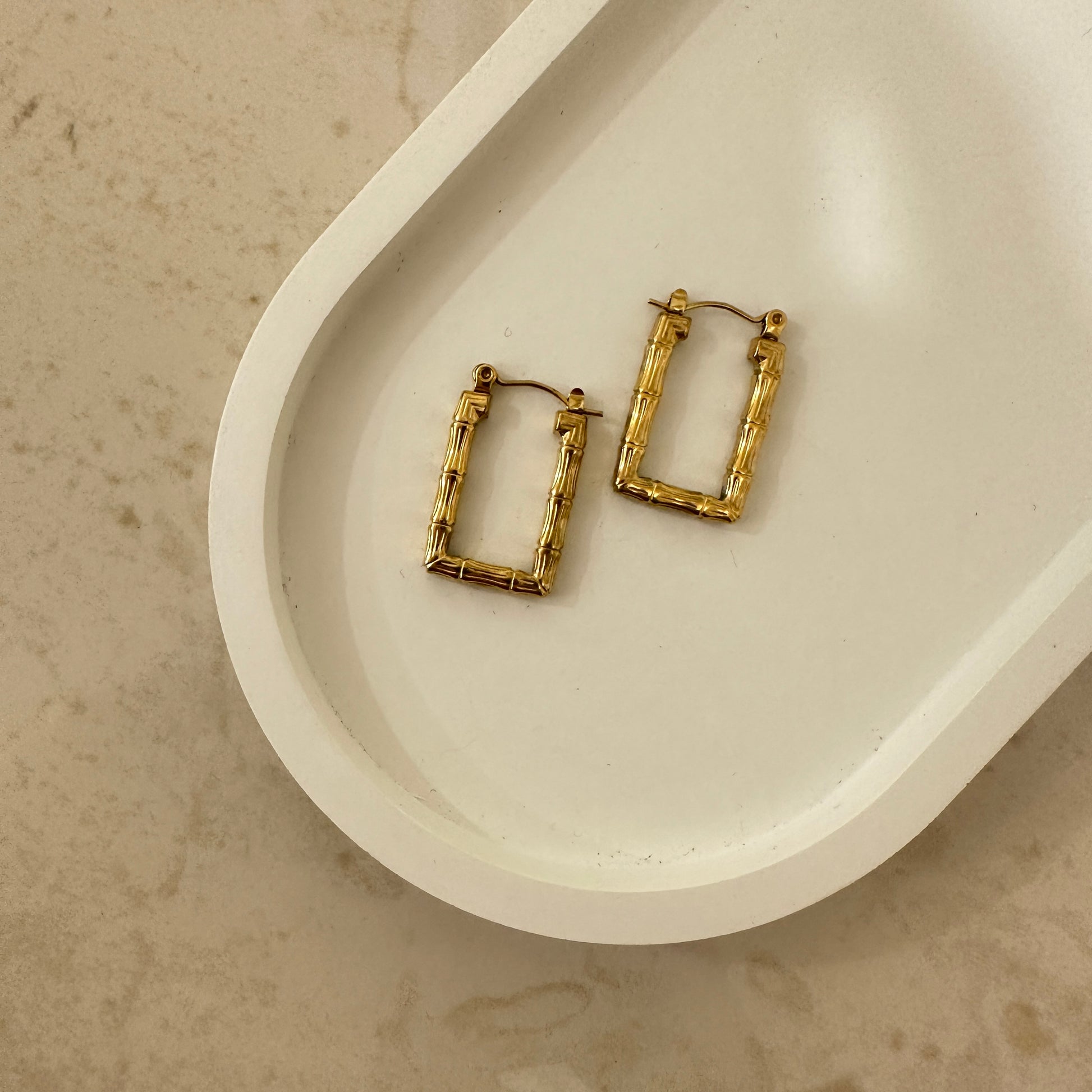 Introducing our Selena Hoops - for those who want to add a touch of whimsy to their everyday look! Crafted from hypoallergenic metal, these rectangle gold hoops show off a playful, different shape that is both dainty and fun. And don't worry about taking them off, they're water proof too!